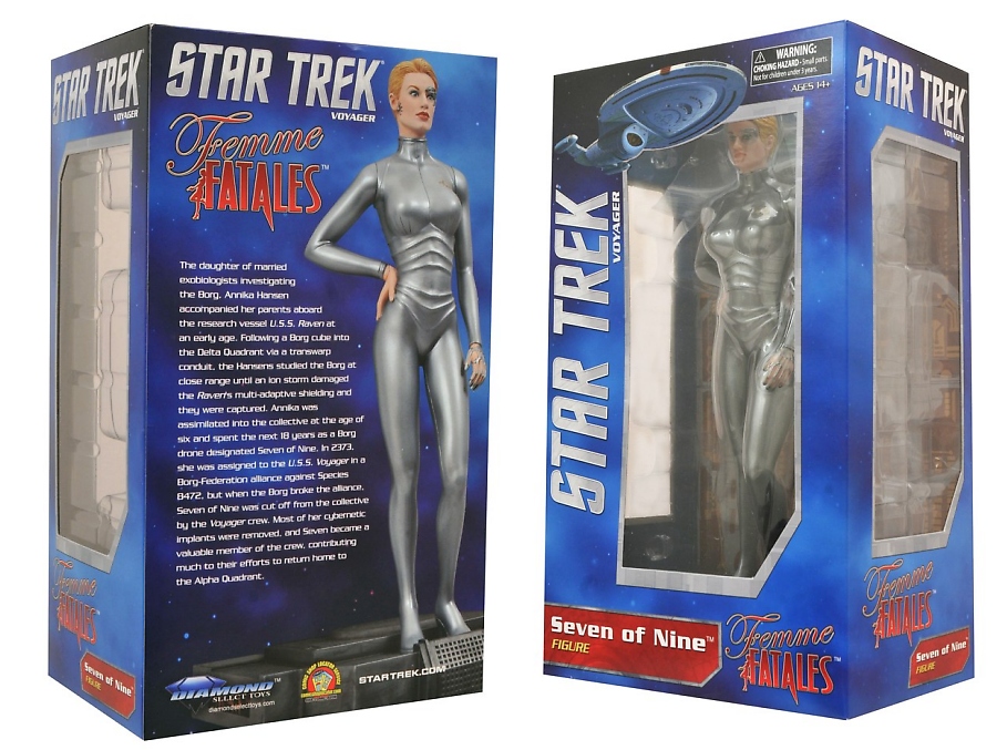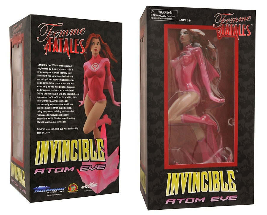 Diamond Select Toys shares with collectors new packaged photos of two new Femme Fatales 9-inch PVC statues. Due out this September, these include Star Trek: Voyager's lovely Seven of Nine (with Borg-inspired base) and the super beauty Atom Eve from Robert Kirkman's comic, Invincible.