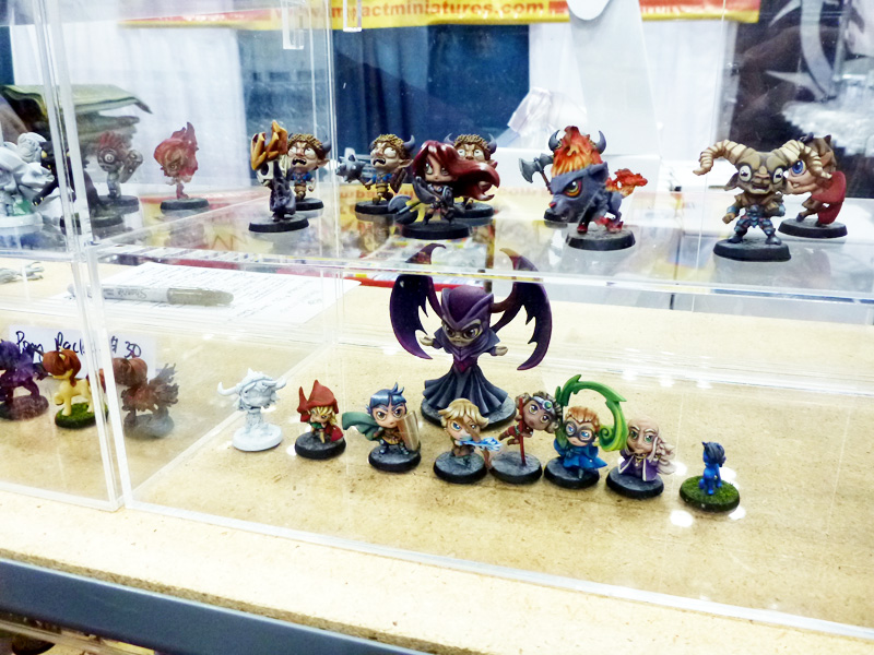 Impact! Miniatures brought a modest but impressive display of models to Gen Con that generated a lot of excitement and interest. On hand were plenty of sports-related miniatures in their Elfball, Roller Derby, and other lines, along with lots of chibis. Some of the particularly cool minis included the Cthulhu chibi, the variety of beauties and cheerleaders, a new pony pack, and the customizable bleachers sets!