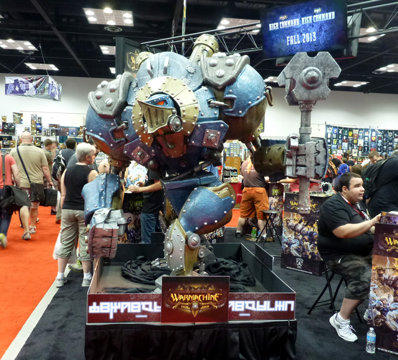 Privateer Press is one of the top miniature game companies with its juggernaut lineup of WARMACHINE and HORDES, not to mention its other great product lines like Iron Kingdoms, LEVEL 7, and more. At Gen Con this year the Privateer Press booth was impossible to miss with its imposing black walls and the rotating sign above it, and of course the massive warjack standing guard over the demo area!