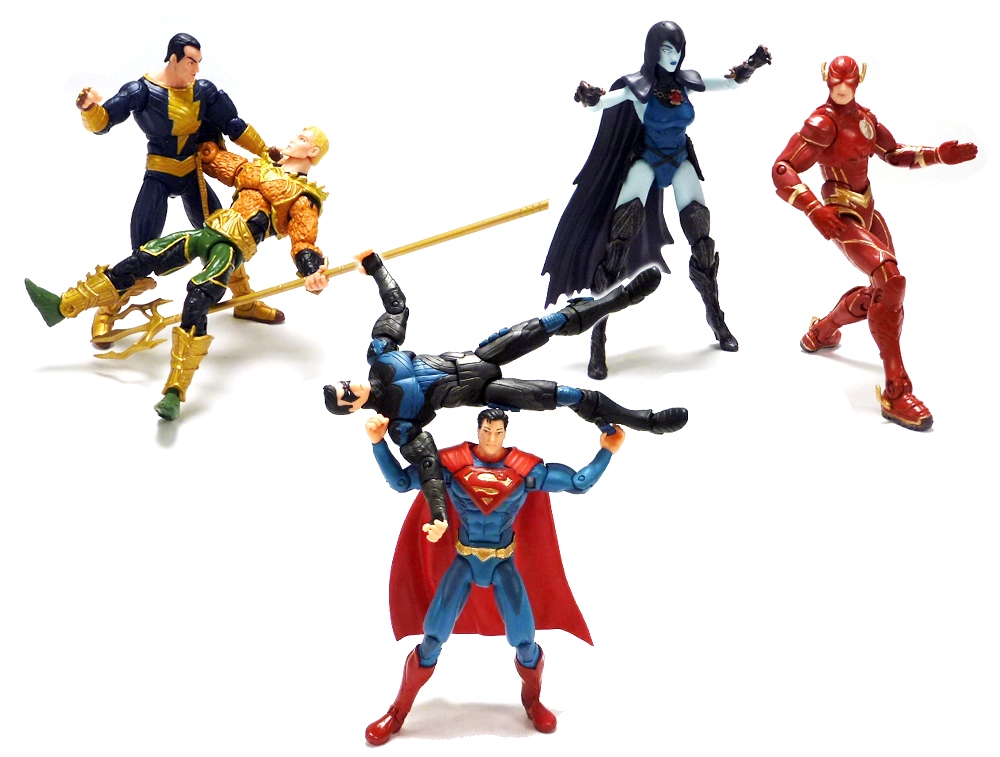 DC Collectibles is best known for its 6 inch figures, but over the last year they’ve made a name for themselves in the 3 ¾ inch market first with Green Lantern-related “Super-Heroes” and more recently with Injustice two-packs. Released earlier this year by Warner Bros. and NetherRealm Studios, Injustice: Gods Among Us brings the classic fighting game format to the DC Comics universe like never before, pitting heroes and villains alike against each other in story mode, challenges, PvP, and more. Not only does the game provide hours of entertainment with tons of great characters, but it also presents them in brand new costumes and distinctive looks. DC Collectibles is leading the charge to bring these fantastic designs to fans in the form of action figures (and more), with the Injustice: Gods Among Us 3 ¾ inch two packs cranking out the most characters in rapid succession. Today we’ll be taking a look at three of those packs featuring the Flash vs. Raven, Superman vs. Nightwing, and Aquaman vs. Black Adam!