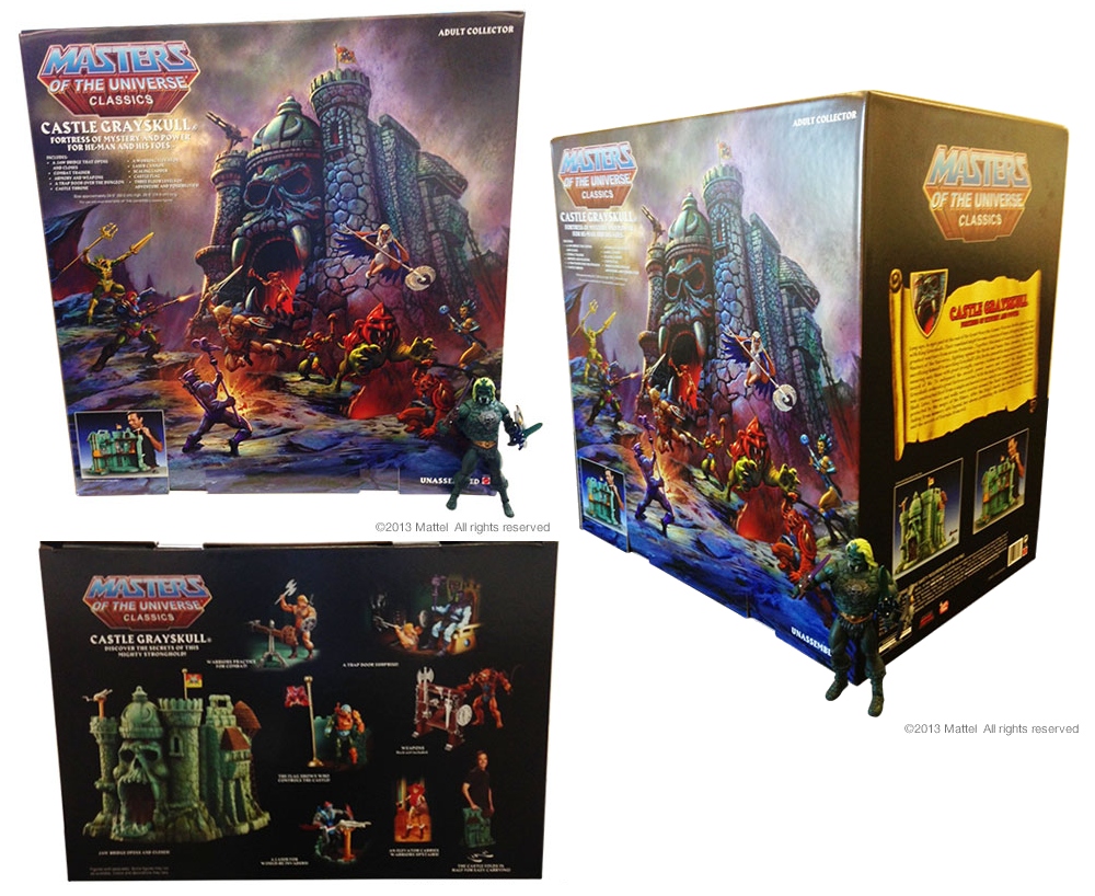 Here's a look at the box art in full color and a closer-to-final castle. This latest model has an elevator with improved functionality, a new paint job, and the chains in the dungeon have been upgraded from plastic to real metal.