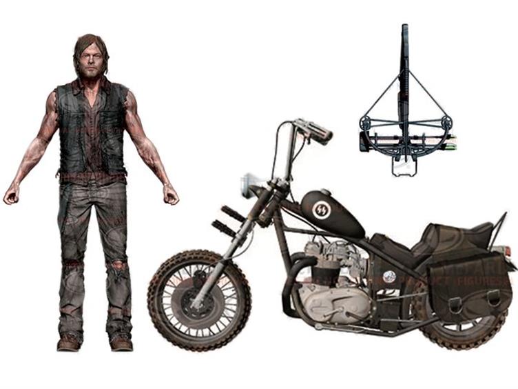BigBadToyStore.com has opened pre-orders revealing a new McFarlane Walking Dead item: a Daryl Dixon with Chopper Deluxe Boxed Set. Priced at $32.99 and scheduled to arrive in March 2014, this 5-inch scale figure set packs the first vehicle for the line. The motorcycle features the lightning-bolt insignia on the tank, skull decal, and saddlebags. The Daryl Dixon action figure includes approximately 20 points of articulation, hunting knife and new crossbow.