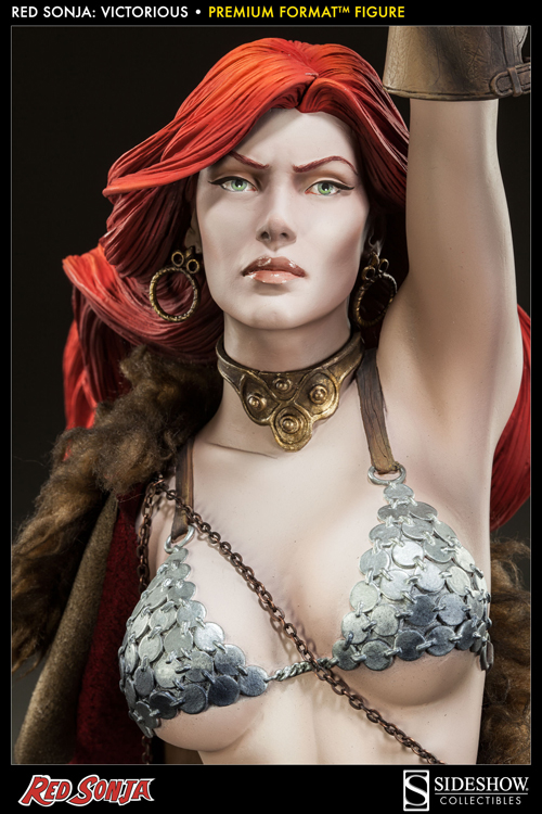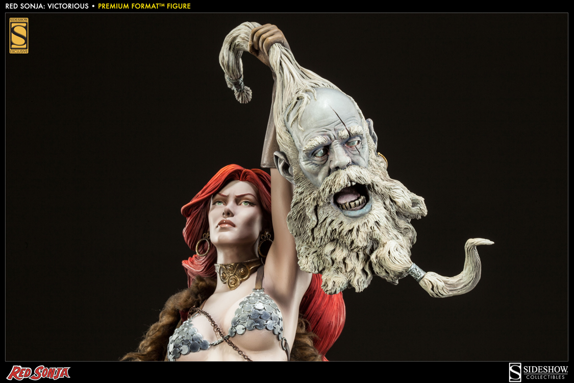 The Red Sonja: Victorious Premium Format Figure depicts the sword-master in a frigid land, standing atop the helmet of a recently defeated opponent. Foregoing heavy, restrictive armor, the fearless combatant wears her iconic scale mail bikini, and a hand-tailored fabric cape with faux-fur collar. The only weapon sharper than her tongue is her blood-drenched sword, which she holds at one side, and with the other she raises the unworthy foe’s blade above her head in triumph. For those that order the Sideshow Exclusive edition, they'll receive a bonus swap-out accessory: a severed Frost Giant's head!