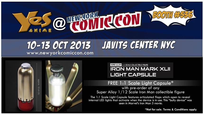 Play Imaginative announces that they will be attending New York Comic Con, displaying new product at the YesAnime booth #536. Over 100 Super Alloy prototype figures will be on display. In addition, for every 1/12th scale Super Alloy Iron Man pre-order made at the show (including the just announced Drones HERE), Play Imaginative will give you a free 1:1 scale Iron Man Mark XLII Light Capsule. The replica features articulated flaps which open to reveal internal LED lights that activate when the device is in use. This "bully device" was seen in Marvel's Iron Man 3 movie.