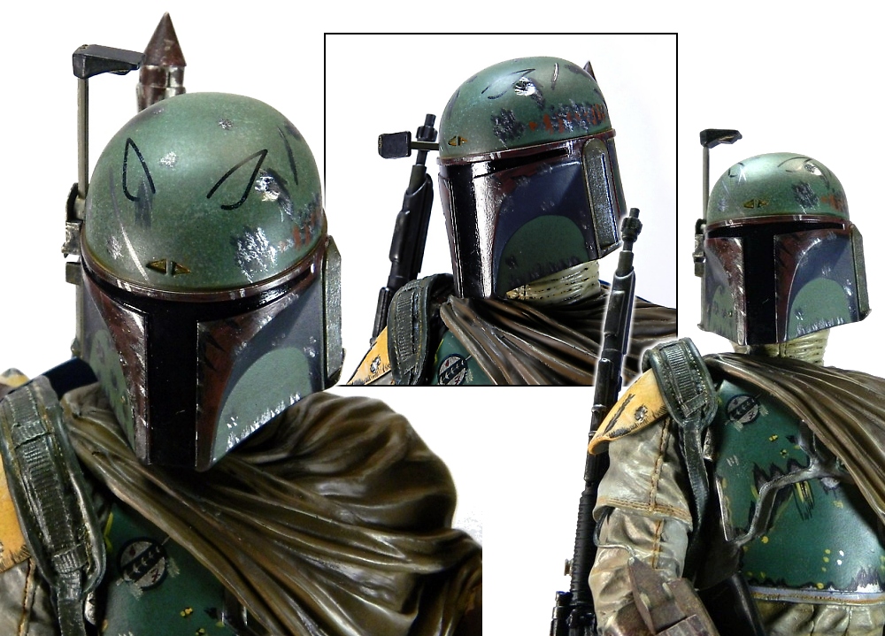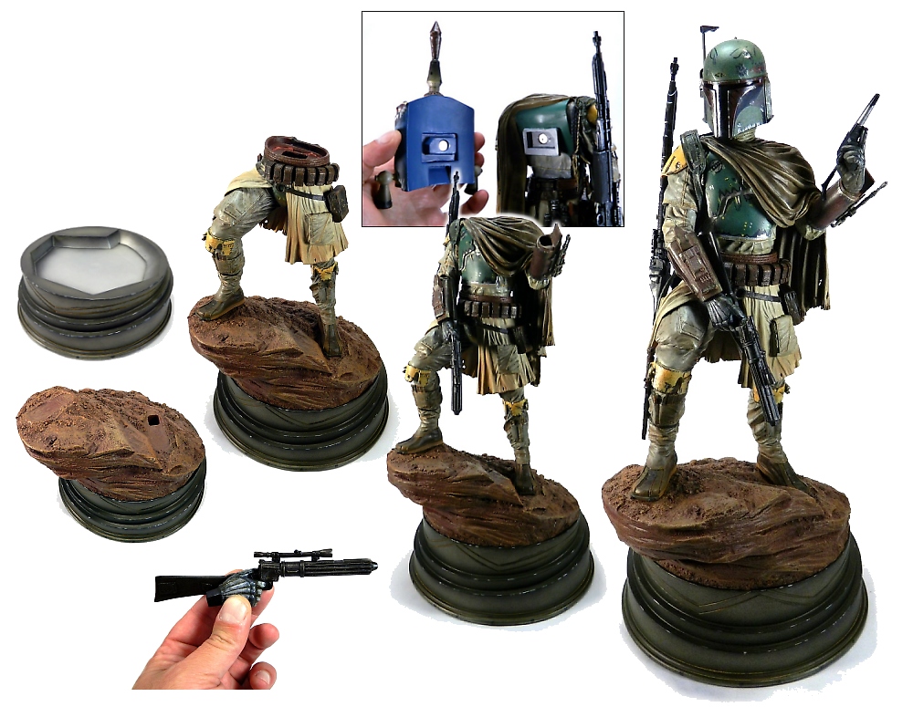 As my photo collage above illustrates, putting Boba Fett together is a layered process. Starting with the large, heavy silver base (with statue information and edition size on the bottom), the statue is constructed by gradually stacking new pieces. Next comes a large rock formation, its unique grooving fitting snuggly into the first platform. Boba's lower body follows, plugging into a hole via a large thick metal rod in his foot. Line him up with the corresponding footprints on the rock base and you're good to go. Strong magnets come into play for the rest of the statue; Boba Fett's head, hands, upper torso, and jet pack all locking firmly into place by magical invisible forces. Last but not least, there is the option to sling a heavy blaster over Boba's right shoulder; the gun securing into a hole via a small peg on the strap. The weapon adds one of many new design elements to Sideshow's Boba Fett, but for the purists out there, the gun can be left off to expose the bounty hunter's trademark braided wookie scalps.