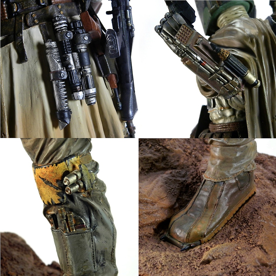 Another cool detail is the kama half-kilt. I've always liked the kama look on the clone troopers, which according to Wookiepedia, came from the Mandalorian culture. So yeah, the kama look for Boba Fett is actually quite fitting. Boba also packs a boot knife, which in the Star Wars universe is most likely a vibroblade. As heavily armed as Boba Fett is, I was actually surprised that I didn't find any grenades. However, I was shocked to discover not one, but three lightsabers clipped to his belt! How cool is that? Seeing that Boba Fett isn't trained in the use of a lightsaber, I envision the weapons more for looks - trophies taken from Jedi he's killed... the same Jedi that Boba Fett holds responsible for his father's death. Those three lightsabers and that massive gun are the two details that truly blow me away with this statue. Really cool stuff.