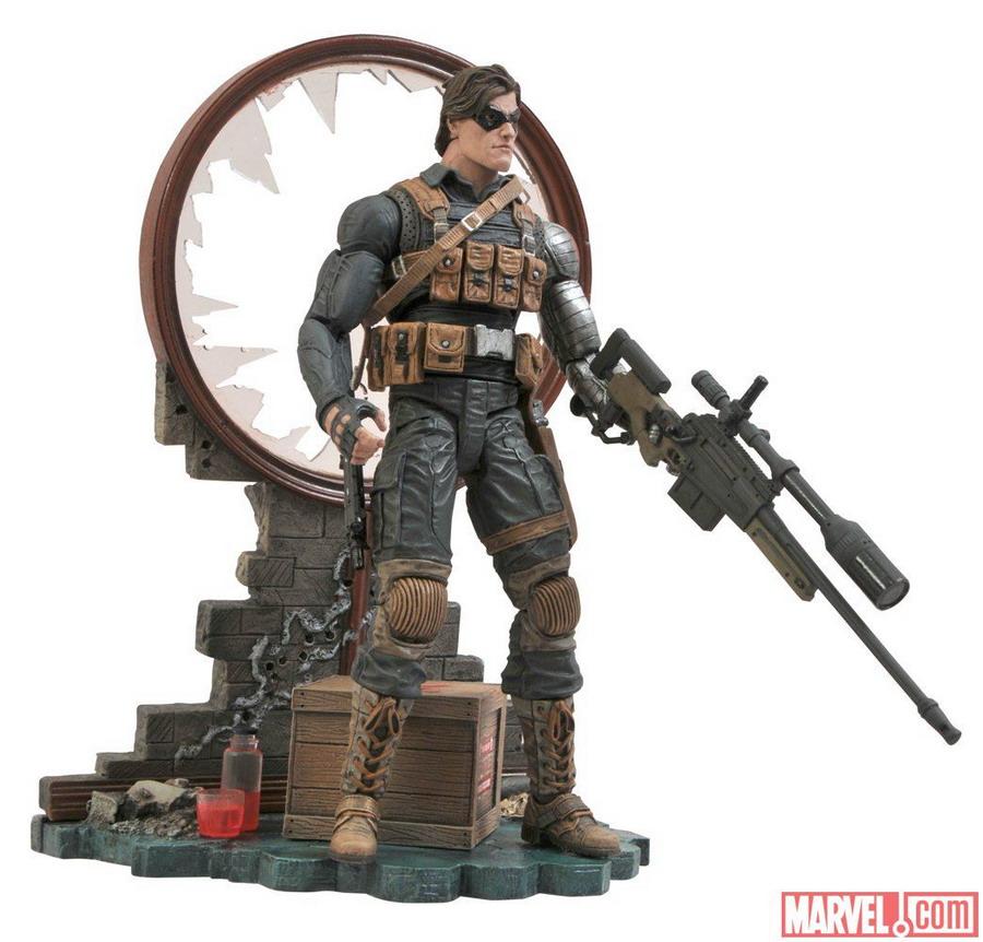 Diamond Select announces, via Marvel.com, that the Winter Soldier will be the next comic-based Marvel Select figure to hit the Disney Store. Sculpted by Jean St. Jean, the comic-based Marvel Select Winter Soldier action figure will be exclusively available at the Disney Store, DisneyStore.com and MarvelStore.com starting in mid-December. The approximately seven-inch figure has 16 points of articulation and comes with a pistol, machine gun and sniper rifle as well as a shattered window display base.