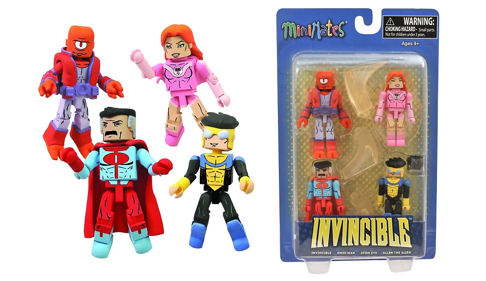 From the mind of The Walking Dead creator Robert Kirkman and Skybound Entertainment comes one of the greatest superhero sagas ever told. Telling the story of a half-alien hero living in the shadow of his famous father, Invincible recently passed its 100th issue, and DST is commemorating the occasion with a set of Minimates. Invincible, Atom Eve, Omni-Man and Allen the Alien are in this set, and each Minimate stands 2 inches tall with 14 points of articulation. (Item #JUN131795, SRP: $19.99)