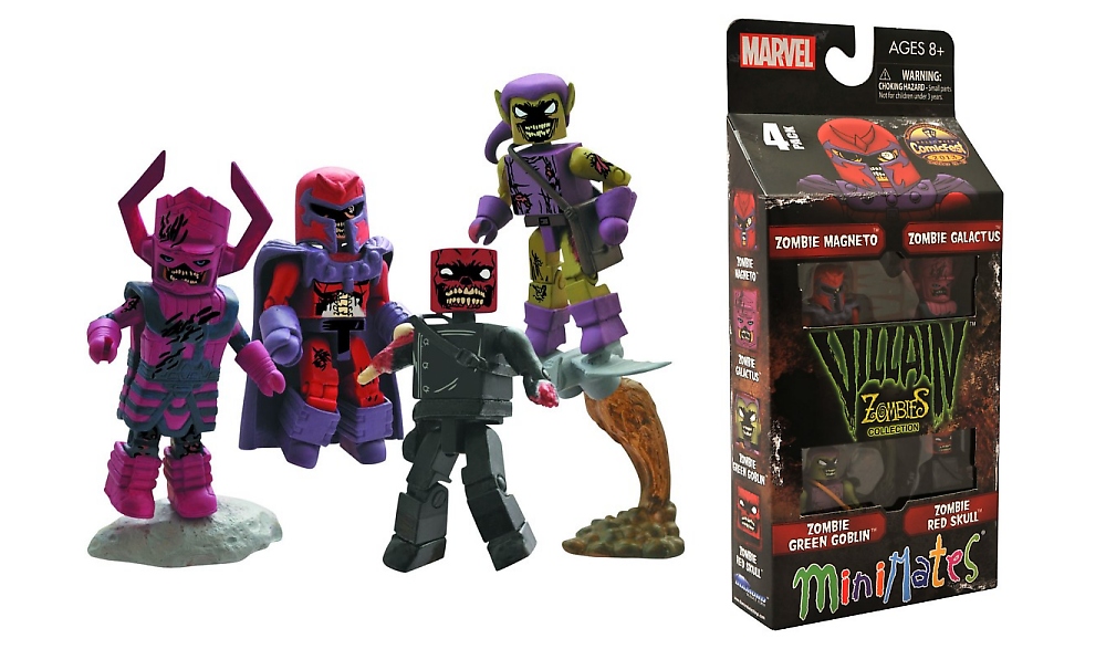 The end of days must be upon us, because Marvel Zombies Minimates are back. This set includes the Red Skull, the Green Goblin, Magneto and Galactus. Each Minimate stands 2 inches tall with a variety of interchangeable and decomposing parts. Packaged in a full-color window box. (Item #AUG132035, SRP: $19.99)