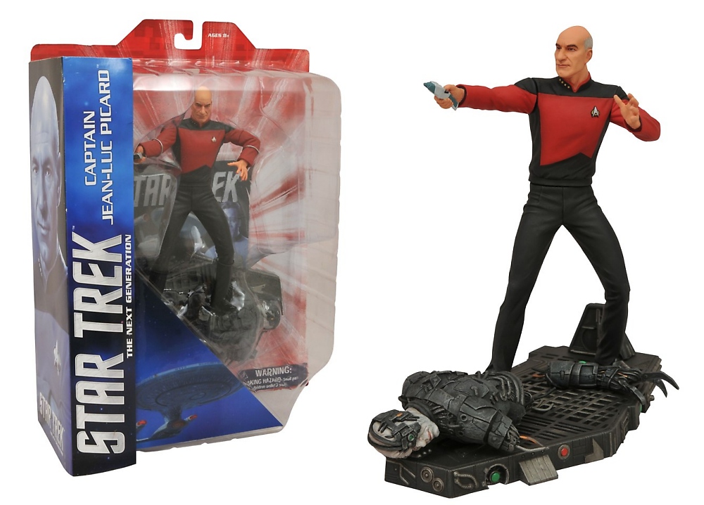 Dynamically sculpted by Patrick Pigott, Art Asylums lead Star Trek figure sculptor since 2003, Picard's default stance is firing a phaser at an unseen foe, but seven points of articulation in his upper body allow him a wide range of expressive poses. Also, his hands and legs are interchangeable with other figures in the Select line, which means youll be able to give him Mr. Spocks classic Tricorder and Phaser. He stands atop a base representing the interior of a Borg cube, and the torso and arm of an exploded Borg rests at his feet. The parts are also removable from the base, so you can take them back to the Enterprise for study when the figure hits stores in late December.