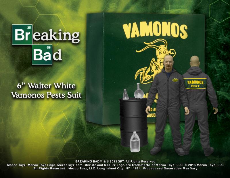 As announced in our story HERE, Mezco will offering two Breaking Bad exclusives as part of their upcoming Black Friday (11-29-13) sale. One item is a set of limited edition challenge coins and the other is an action figure, revealed today to be a 6" Walter White Vamonos Pests Suit. This figure will be strictly limited to 500 pieces worldwide and will be available exclusively through MezcoToyz.com priced at $75.