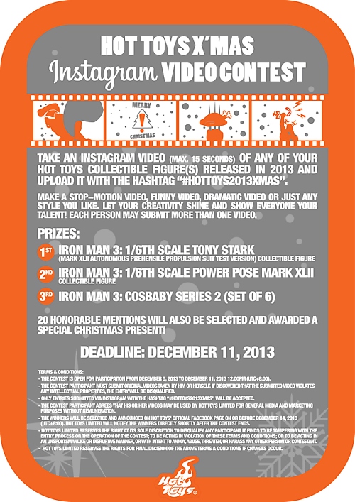 To enter the contest, all you need to do is to take an Instagram video (Max. 15 seconds) of any of your Hot Toys collectible figure(s) released in 2013 and upload it with the hashtag #hottoys2013xmas.