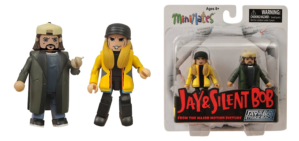 Snootchie bootchies! Jay and Silent Bob have been in movies, comic books and cartoons, but you've never seen them like this! This new two-pack of full-color Minimates mini-figures depicts the dynamic duo as they appear in Kevin Smith's feature film Jay and Silent Bob Strike Back. Each Minimate stands 2 inches tall with 14 points of articulation and features interchangeable parts. (SRP $9.99, ITEM #SEP131915)