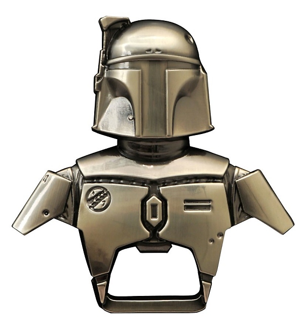 Boba Fett? Where? On your brand-new bottle opener, that's where! Make sure you always have a way to open tasty beverages with this solid metal bottle opener, depicting the portrait of Boba Fett, super-cool bounty hunter extraordinaire! It measures 4 inches long, has magnets on the back and removes bottle caps like Boba Fett captures a bounty -- with style! Comes packaged in a collectors slip case with a full-color wrap. (Item #JAN141922, SRP: $18)