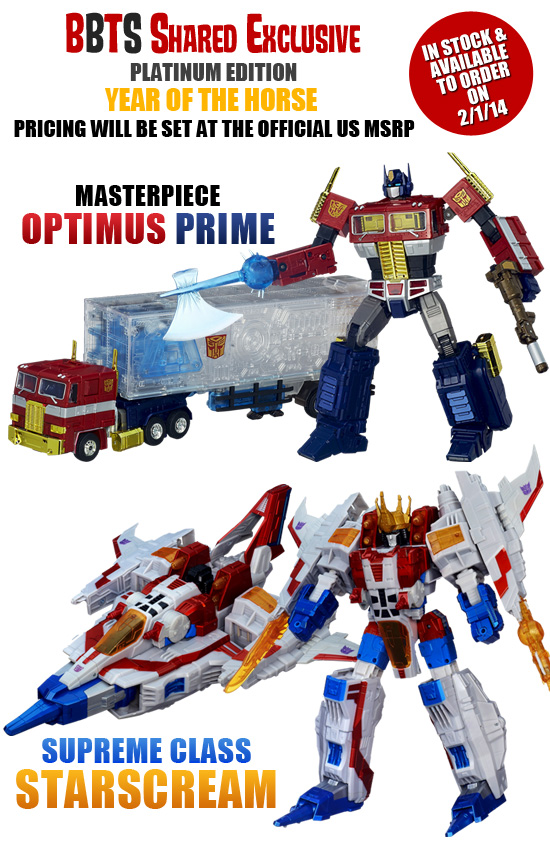 BBTS will carry the Year of the Horse Platinum Edition Supreme Starscream and Masterpiece Optimus Prime. These items will be in stock and available to order on February 1st, 2014 - the official on-shelf date set by Hasbro.