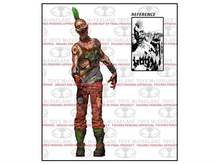 Our Punk Rock Zombie blends the horror of zombies with the rebellious aesthetics of punk rock to create a visually unique and unforgettable figure. Inspired by page 17 of The Walking Dead #30, you'll need something bigger than a safety pin to fend off this foe! As the prison survivors brace for an attack from the Governor, Dale spots Tyreese returning from a dangerous mission. With only his suit of riot gear to protect him, Tyreese charges through a field full of walkers – including one with a tall, punk mohawk. Our interpretation of this distinctive undead shambler fills out what isn't shown in the comic, adding classic punk details like a spiked collar and cuffs, studded belt with anarchy buckle, ripped jeans, and combat boots. Figure also comes with guitar accessory – so your survivors can wield an "axe" against the rest of your zombie hordes.