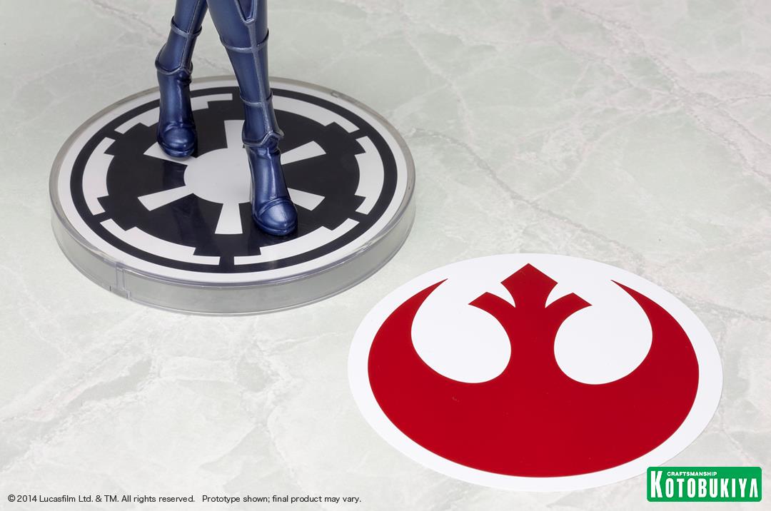 How will you display Mara Jade? With the Imperial seal or Rebel Alliance insigna? The choice is yours with the two (2) included base graphics and different lightsaber hilts and colored blades that Kotobukiay is including with their Mara Jade ARTFX Bishoujo Statue. This 9 inch tall (1/7 scale) collectible is scheduled for release this May priced at $64.99.