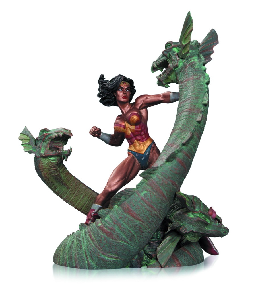 The Amazon Princess faces against one of the most famous monsters from Greek Mythology, the multi-headed hydra, in this detailed patina statue! Measures Approximately 7.5" Tall.