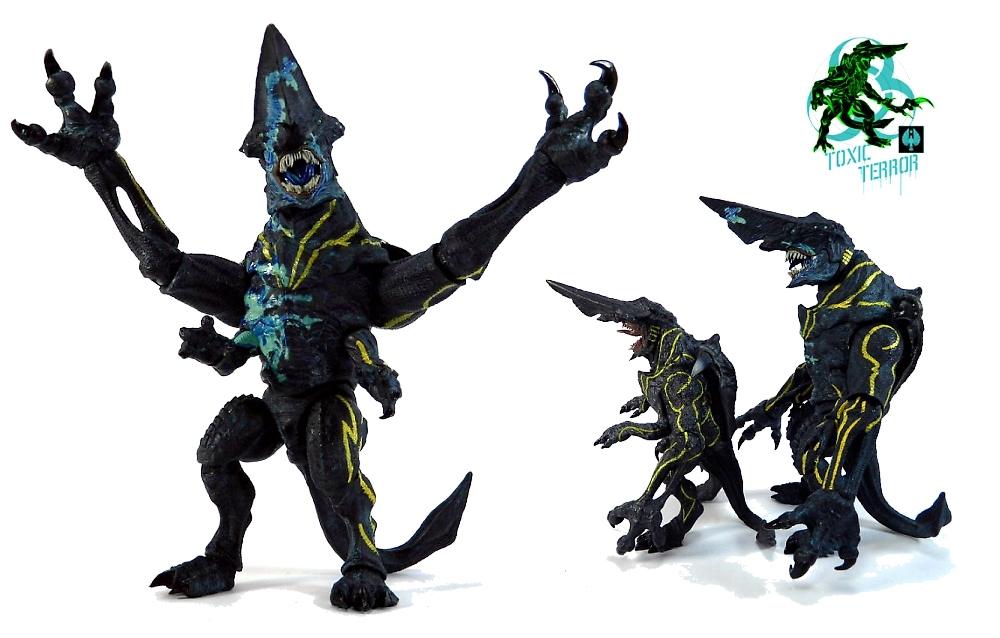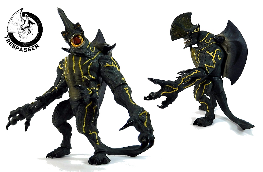Articulation on this beast is identical to the new Battle Damaged Knifehead, which lets face it, is ALOT. These are the most articulated Kaiju NECA has created so far. What makes this figure a must-have is that cool chopping portrait and curved crest plate on Trespasser's back. Unlike Knifehead's flat tortoise shell, Trespasser features a new design that looks as lethal as his bladed head. It creates an awesome silhouette and is my favorite Kaiju design in Pacific Rim. Another thing I like about Trespasser more than Knifehead is his color scheme. Where Knifehead is tar black, Trespasser has this nice charcoal grey color. The lighter hue really allows the figure's scaly sculpted detail to shine through. The glossy black talons and swirling yellow tribal markings (which, by the way, are different than Knifehead's) truly accent the creature's grey body and a realistic coating of dusty browns brings it all home. I almost forgot the eyes! Knifehead's shark-like blue eyes were cool, but Trespasser's eyes - all four of them - pierce with a yellow and red lizard-like quality. So cool. Like Knifehead, the figure features a snapping jaw, the protruding teeth and inner tongue giving even more character to the figure. I honestly don't know how anyone could buy just one figure in this assortment. They are all so cool and unique.