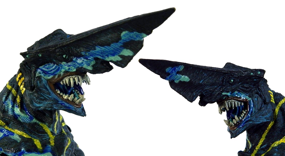 Larger size aside, NECA's new Knifehead comes loaded with new articulation points. Most notably is the addition of ball-joints on the smaller pair of arms jutting out of the chest. Where the previous version's small arms were static, fans can now pose them all around for added display power. Other new joints include ball-sockets at the shoulders (as opposed to cut), elbows (as opposed to just being hinged), ball wrists (as opposed to nothing), ball-jointed head (again, opposed to nothing), ball thighs (opposed to swivel) AND ball-jointed feet (opposed to nada). That is a TON of new articulation, all ball-jointed, on a figure that previously featured none. Returning articulation points include the bendy tail and opening and closing jaw. It's all wrapped up with a new "battle damaged" deco, Knifehead splattered with his glowing blue blood. I'm not a huge fan of battle damaged variants, but the pros of owning this Knifehead over the previous version are simply ridiculous. It's like comparing apples and oranges.