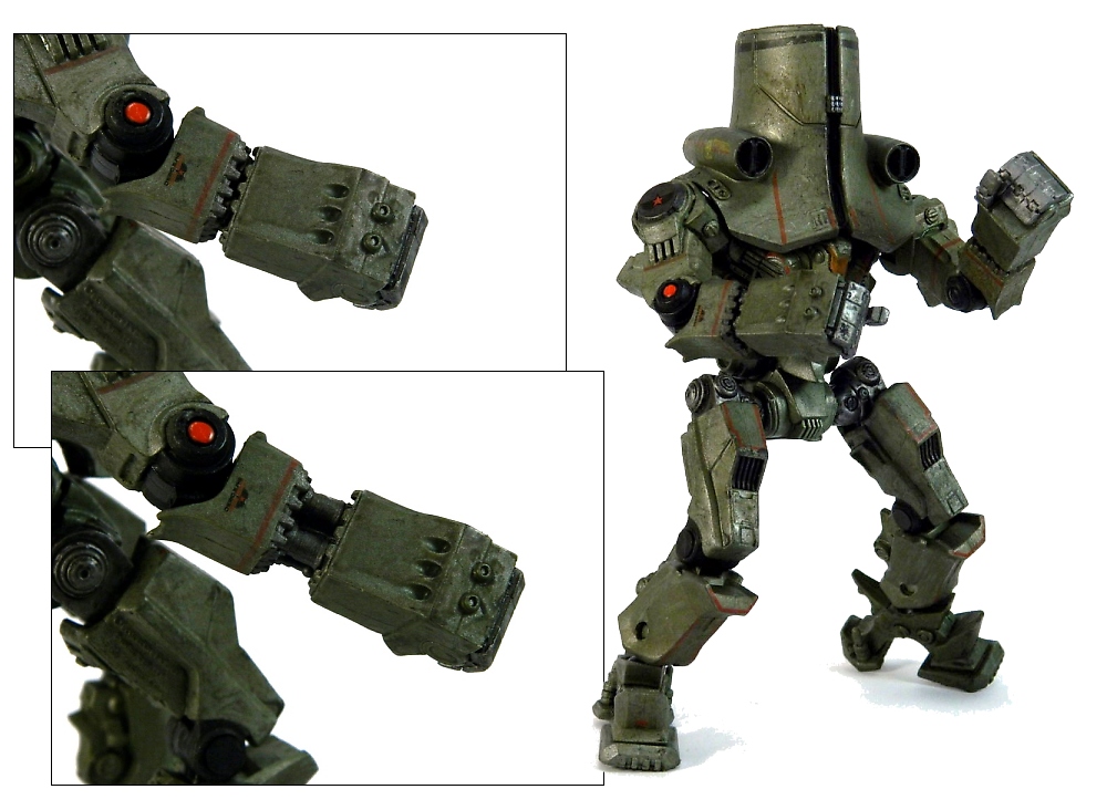 Let's start with my favorite figure of the bunch, Russia's Jaeger brute, Cherno Alpha. Where other Jaegers in the movie invoke images of preexisting mecha designs, the Cherno Alpha stands unique. There's nothing quite like it out there. A "tank class" robot if there ever was one, the Cherno Alpha pummels its way to victory with pneumatic fists. In battle, each claw-like hand closes to grip what can be best described in hand-to-hand melee as a roll of coins, in this case a steel rod. Like a pair of brass knuckles, this allows the Cherno to inflict much greater damage. Combined with the extending power fist feature and you have yourself a Kaiju knockout. The Cherno Alpha went out like a chump in Pacific Rim, but at least it got in a few good hits.