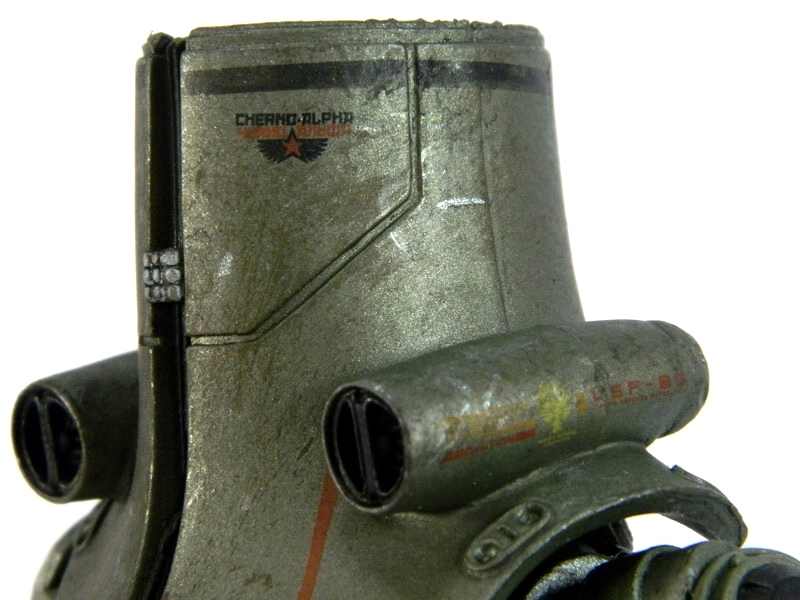 Topping off the Cherno's incredible construction is a stellar paint job. Capturing Russia's military might, the Cherno Alpha stars an olive green and dull red color scheme. Black washed steel breaks up the color palette at all the appropriate joints, while pops of red livery and insignia really draw your eye all over the design. A realistic layer of worn and weathered dry brushing pulls it all together. It's amazing how small and realistic NECA can get with their tampo stamps - micro logos like "Cherno Alpha" on the head are clear and readable. Stunning. The 18" version of the Cherno Alpha is going to rock so hard!