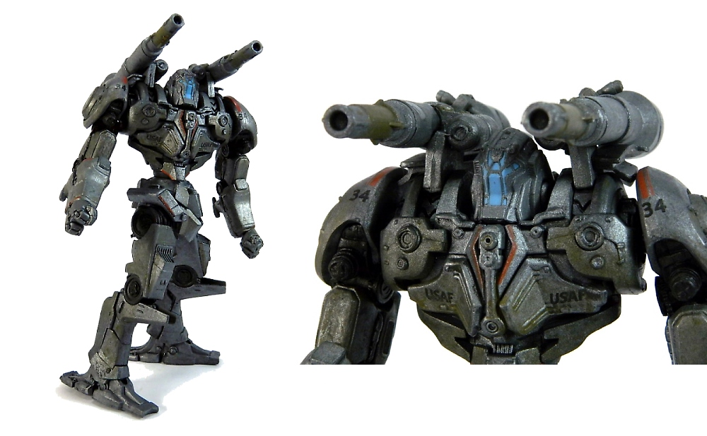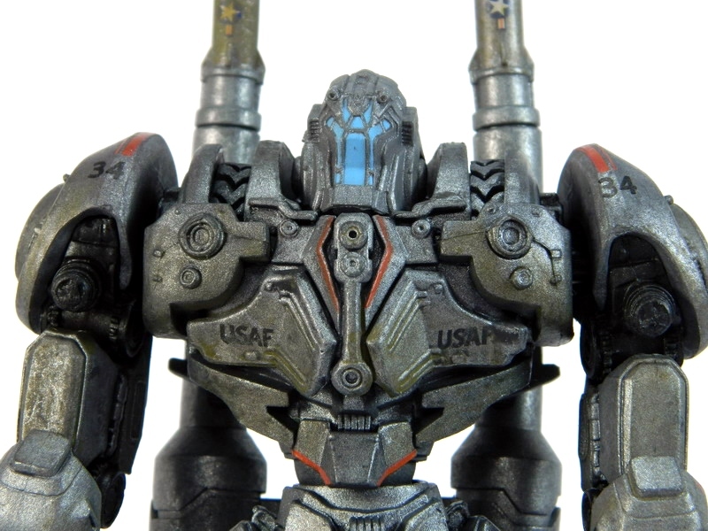 The Coyote Tango shares a similar color scheme to the Striker Eureka and Gipsy Danger; an almost naval warship vibe. However, where the Striker was a destroyer grey and the Gipsy an almost battleship blue, the Coyote appears the most metallic of the bunch painted (or not?) a battle-hardened burnished steel. NECA applied some nice weathering on this figure by using a dirty brown. It gives the Jaeger an almost rusty look, as if the raw metal was left exposed to the elements for too long. Like the Cherno, the use of red livery and tiny tamp stamps ("USAF", "34") really go a long way in making the Coyote Tango look like a real war machine.