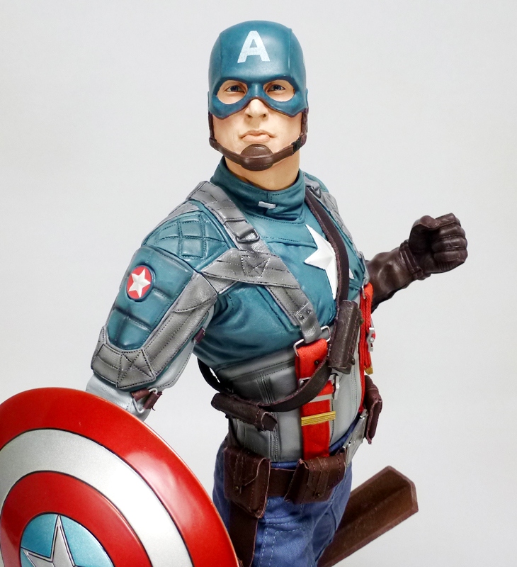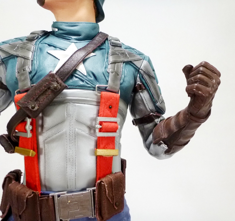 Returning Cap to the public eye, Captain America: The First Avenger starred Chris Evans as the titular character, and as his transforming alter ego. Naturally they nailed the Steve Rogers look with the blond and muscular actor, but that’s just part of the overall Captain America package. Marvel Studios had the difficult task of creating a cool and believable costume for the Avenger, and of course the iconic shield. After a decidedly retro USO costume inspired by the classic comic book look, Rogers donned what would become that film’s definitive outfit, a rough and tumble jumpsuit with gloves, boots, belt with pouches, and lots of straps. That’s the version captured in Sideshow’s PFF, and it’s both film accurate and cool looking.