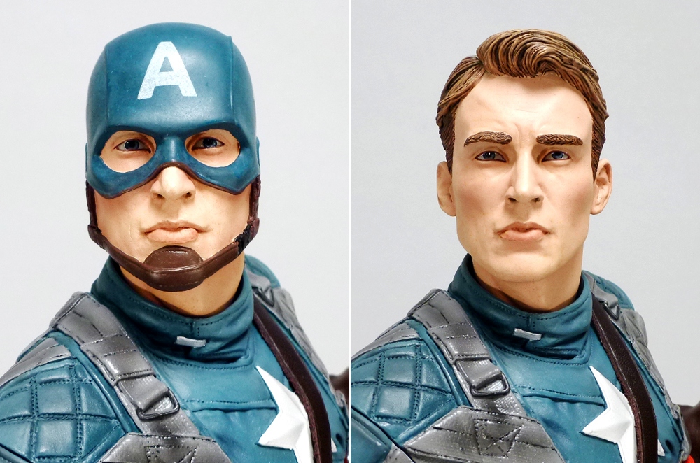 And while drab compared to the figure, the base is also intricately sculpted and full of things to look at and notice like the variegated rubble, the lifelike molding of the sandbags under Rogers’ weight, and of the fantastic crossed beams behind him with rivets, rust damage, and more. As previously noted, the figure comes with two different portraits that you can swap out at any time, masked and unmasked heads. This is purely up to your preference, as both look great. The first version wears the costume’s unique masked helmet with ear guards and chinstrap, while the other features the full Chris Evans sculpt and perfectly coiffed hair. Both versions resemble the actor strongly without going the full scanned route and feature the same focused and brave expression.