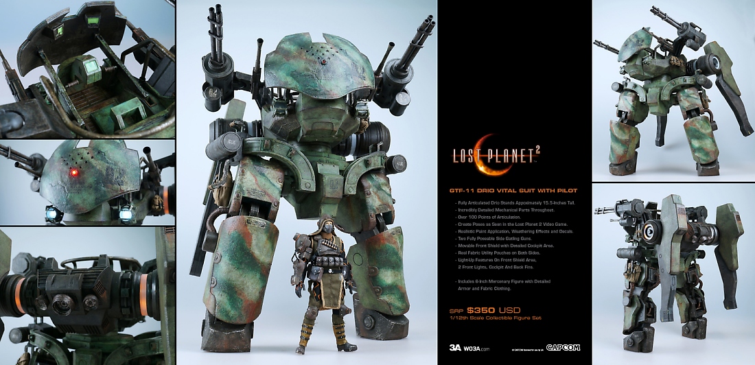 Awhile back we reported that ThreeA Toys had aquired the license to produce action figures based on Capcom's 2010 sci-fi shooter Lost Planet 2 (read our story HERE). A 12" Mercenary was the first figure in the series, and now 3A shows off a 1:12th scale VITAL SUIT with 6" Mercenary figure set. while ordering details have not been announced yet, the above image with specs has been released. To be priced at a SRP of $350 USD, this set will feature: