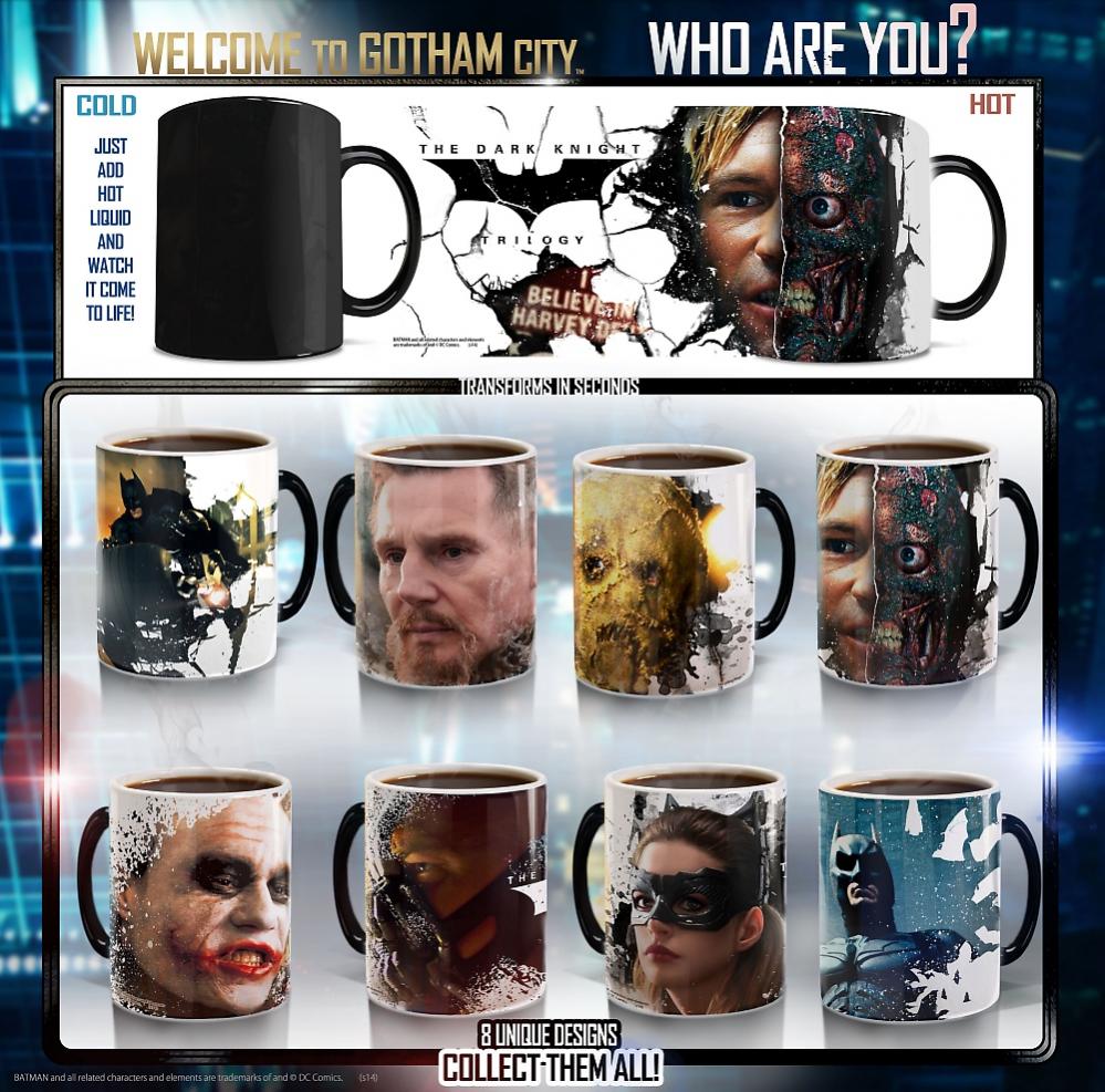 Trend Setters (filmcellsltd.com), creator of the Morphing Mug line, along with Warner Bros. Consumer Products on behalf of DC Entertainment, introduces a set of eight The Dark Knight Trilogy Morphing Mugs. Black when cool, these amazing character mugs reveal uniquely stylized Batman art when hot liquid is added.