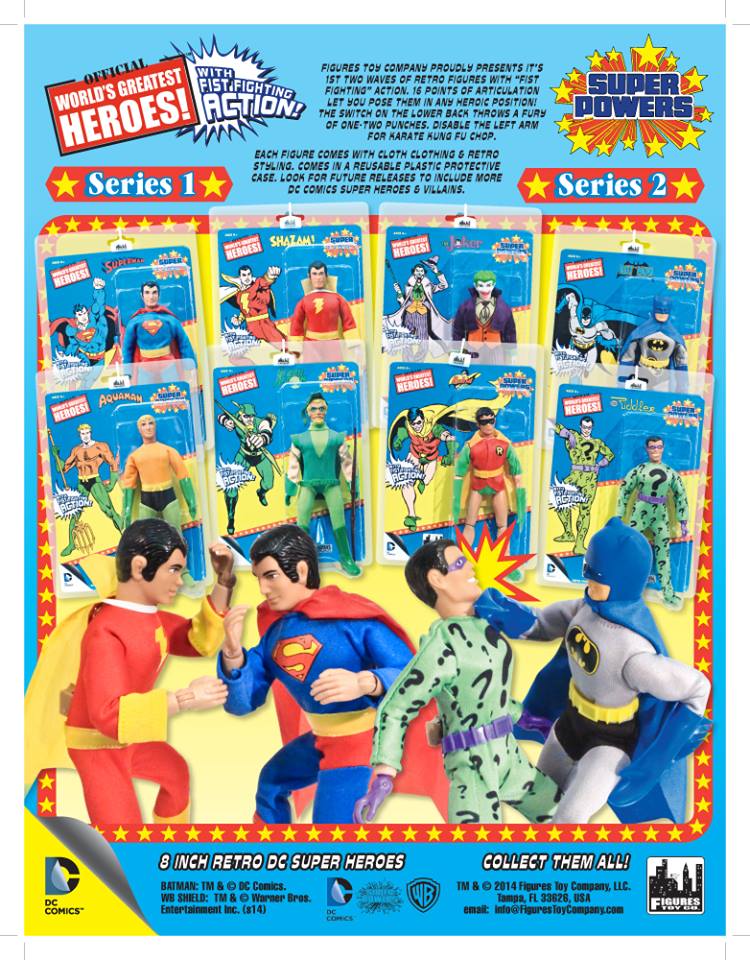 Figures Toy Co. continues to dominate the retro Mego action figure market with a new series of 8-inch DC Superheroes. Called Super Powers, the series delivers toys with a "fist fighting" action gimmick all wrapped up with a nostaglic Kenner’s Super Powers packaging theme (this year marks the 30th Anniversary). Pricing and release details are to be announced, but the first two waves have been revealed above, including such iconic DC characters as Shazam, Superman, Aquaman and The Joker.