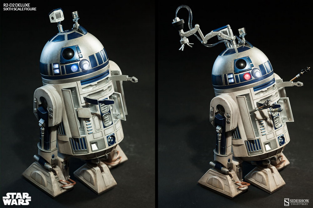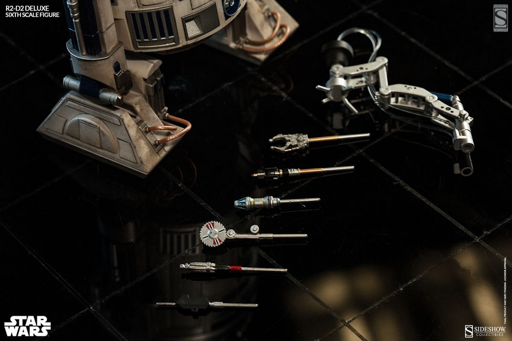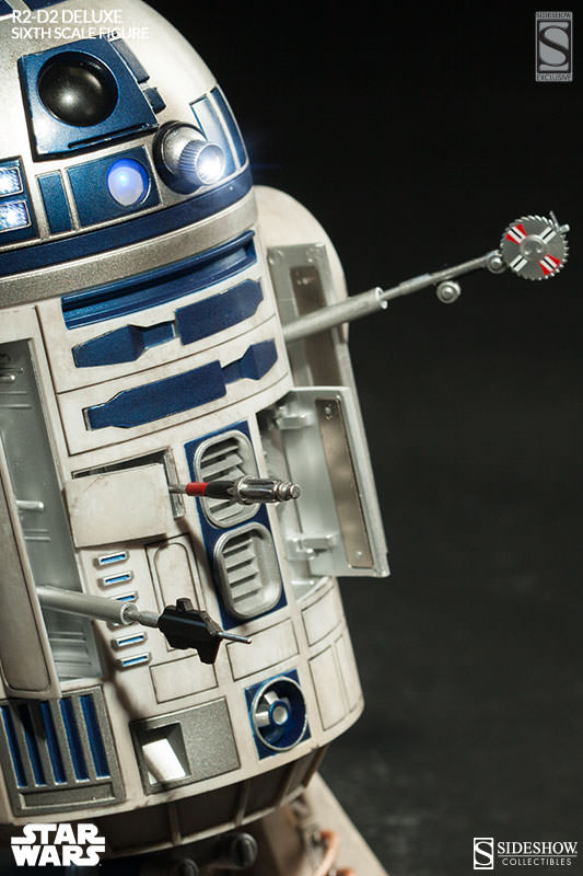 Sideshow has released new photos of their 1:6th scale R2-D2 action figure. The images show off the astromech's many features, including sequencing lights and a swiveling dome that features various moveable ports and hinged panels. Additionally, Artoo features a hidden Skywalker lightsaber hilt with a magnetic tip that allows access to a range of his internal gadgetry, including periscope, life-scanner, and multiple articulated arms for performing various intergalactic duties.