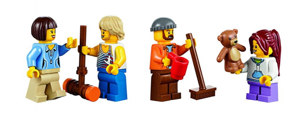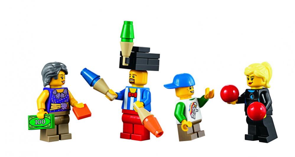• Includes 12 minifigures: a juggling man on stilts, dunk tank lady, strong man challenger, ticket lady, truck driver, ride operator, 2 women, 2 girls, 2 boys and a queasy man who tried the mixer one too many times