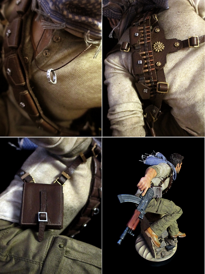 His costuming is tailored well and consists of cargo pants and a long-sleeved short. The clothes have been given a weathering treatment to make them look grimy and worn and really give them a more realistic feel. The harness and holsters are made from a leather-like material that sits loosely on the statues and requires a little fussing to secure. The piece that is most frustrating is the shemagh. It really takes a lot of effort and extra fluffing to get the scarf to lay just right to match the production and game images, but once it’s done it really brings the piece together.