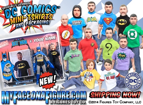 MyFaceOnAFigure.com has partnered with DC Comics allowing the collector community to purchase their very own custom action figure wearing a DC superhero t-shirt. Custom figure t-shirts include the familiar logos of heroes like Superman, Batman, and The Flash. Custom two-packs, featuring a popular DC Comics character alongside the collector's very own custom figure, are also being offered.