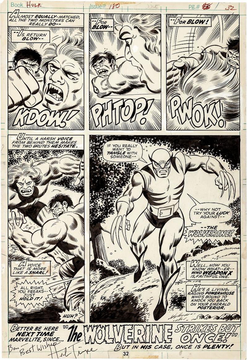 The original artwork featuring the first ever appearance of Wolverine, by artists Herb Trimpe and Jack Abel, on the final page of The Incredible Hulk #180 (1974), arguably the most important debut of a comic book character in the last 40 years, tied a record for any page of American comic art and set a world record price for any page of interior comic art, by far, when it brought $657,250 (including 19.5% Buyer’s Premium) on May 16, 2014, at Heritage Auctions in Dallas.