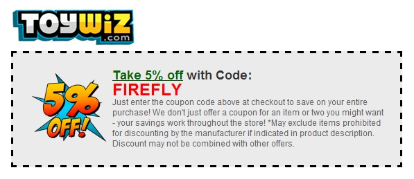 ToyWiz.com has thousands of in-stock items. Use the coupon code FIREFLY and receive 5% off your purchase! Shop from an incredible selection of the newest and most popular action figures, toys, and collectibles including: