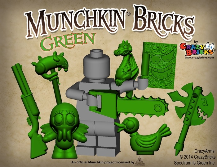 This one doesn't pertain specifically to miniatures or miniatures games, but it's really cool and chances are you're familiar with at least one of the elements involved: Steve Jackson Games' Munchkin or construction toys like LEGO and the like. Crazy Bricks, creator of some awesome custom contruction toy elements is on Kickstarter now with Munchkin Bricks, a project bringing some of the most unique accessories and weapons from the card game to life! Each set of items includes the Unnatural Axe, Rat on the Stick, Triple-Barreled Shotgun, Munchkinomicon, Chibithulhu, Chainsaw of Bloody Dismemberment, Cute Shoulder Dragon, and Duck of Doom plus any stretch goals (thus far one has been unlocked - a Miter!), and you can get your set in gunmetal gray, brown, green, or glow in the dark.