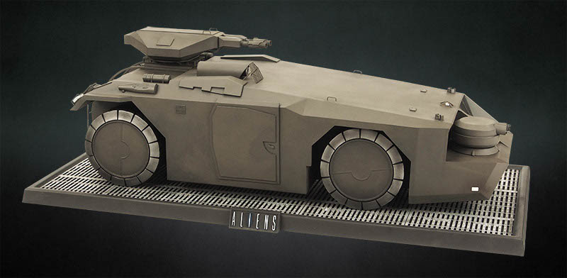 The APC features moveable gun turrets and rotating wheels, and is authentically weathered for added realism. It is complete with a separate Aliens themed display base, designed to replicate the floor tiles of the Sulaco.