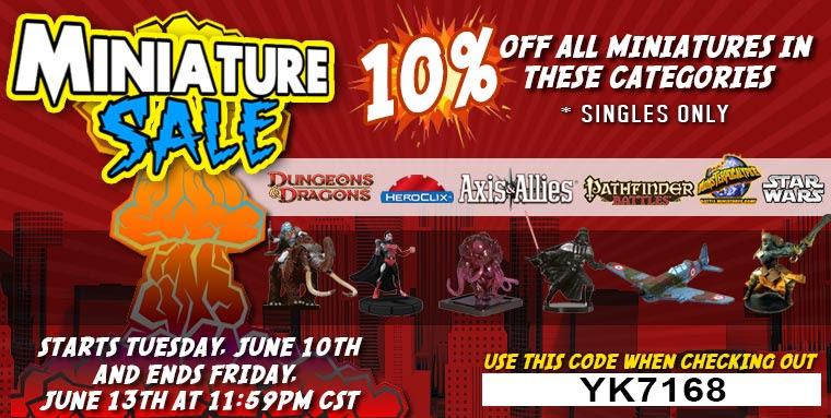Miniature Market is having a limited time sale on select miniatures! Save 10% off such popular minis as Dungeons & Dragons, HeroClix and Star Wars. Simply enter the code YK7168 at check out! Sale runs from today until this Friday, June 13th at 11:59PM CST.