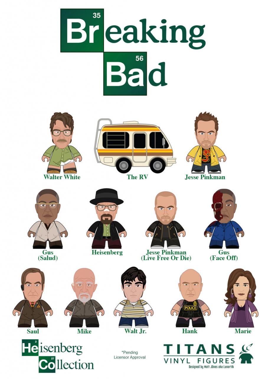 From Sony and Titan Merchandise comes The Heisenberg TITANS Collection celebrating the hit series Breaking Bad. This 12 piece set features mild mannered chemistry teacher Walter White as well as his murderous, drug dealing alter-ego Heisenberg, his naïve partner in crime Jesse Pinkman and a whole barrel full of friends and foes, including The Crystal Ship itself – The RV!