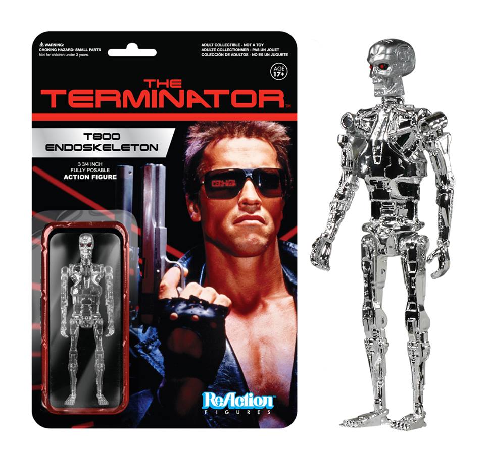 Funko provides a better look at their upcoming ReAction figure assortment based on characters from 1984's sci-fi classic, The Terminator. Scheduled for release this August, The Terminator ReAction series stars Arnold Schwarzenegger in his many incarnations as the unstoppable T-800 killing machine: Tech Noir, Police Station Assault and Endoskeleton (including a chromed out version!), as well as the film's protagonists Sarah Connor and Kyle Reese.