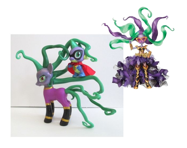 USA Today reveals Hasbro's My Little Pony San Diego Comic Con 2014 exclusives. These include a character called Mane-iac Mayhem that will be offered as a My Little Pony Equestria Girls Mane-iac Mayhem Doll ($29.99 - pictured above right) and in pony form (above left). Hasbro comments on this exclusive "This power-mad pony from Maretropolis features a metallic purple outfit, accessorized with fashionable black and gold glittery boots. She comes with Spike the Dragon as 'Hum Drum.'" This pony will retail for $49.99.