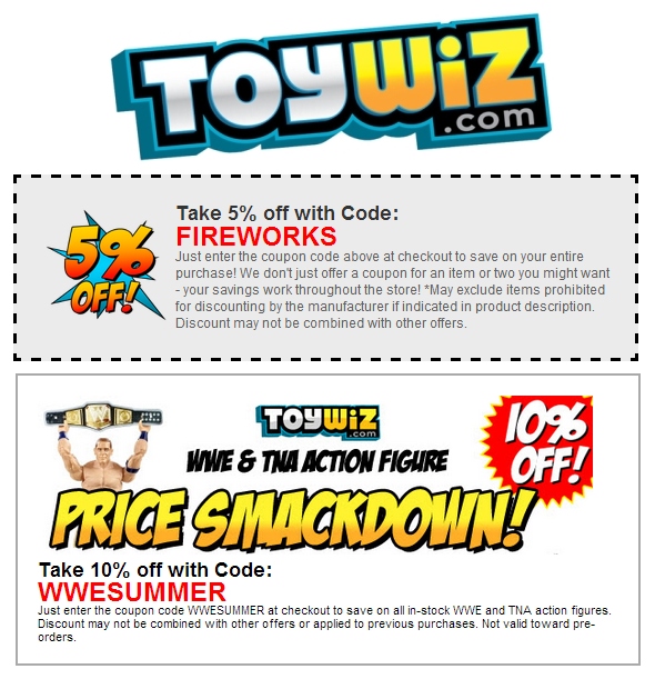 ToyWiz.com has thousands of in-stock items. Use the coupon code FIREWORKS and receive 5% off your purchase! Better yet, get 10% Off On All In-Stock WWE and TNA figures using coupon code WWESUMMER!