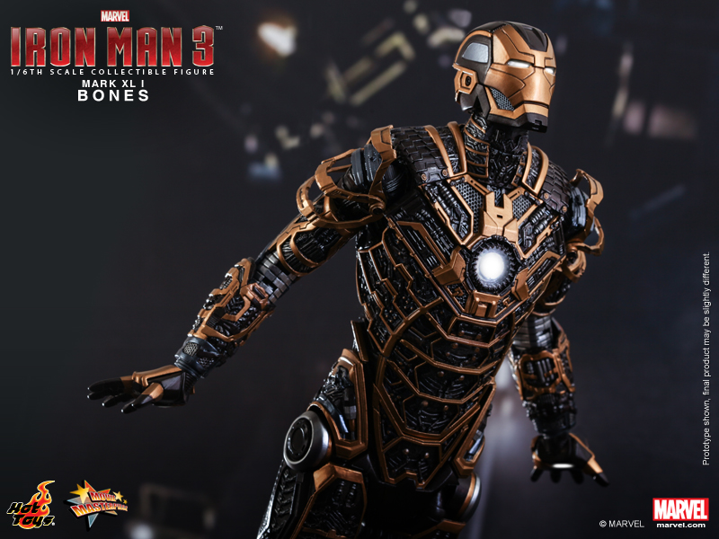 Today Hot Toysreveals this distinctive armor from the Iron Legion in 1:6th scale action figure form: the MMS251 Bones (Mark XLI) Collectible Figure. In addition to featuring finely crafted structure, black and gold colored armor, LED light-up functions and accessories, this collectible figure has specially designed magnetic components which allow it to be split into multiple parts and re-attach back together at will.