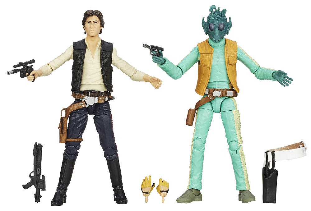 Recreate the biggest Star Wars battles with figures from The Black Series. Han Solo and Greedo face off in the Mos Eisley Cantina. Han has been dodging the bounty hunter for a long time, but at last Greedo has tracked him down. This set includes two highly articulated 6-inch figures that are part of the ultimate Star Wars collection. Both figures have holsters and blasters, and the Han Solo figure has an extra set of hands.
