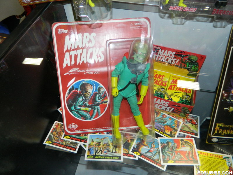 Heroes in Action, best known for their hilarious Mego-style Presidential Monsters, was at Comic-Con with a new license: Mars Attacks! A show exclusive two-pack featuring a Martian Soldier and Baracula (see HERE) was offered for sale to debut their new series of 4 inch-tall "Jr." collectible figures. Another exciting format for Mars Attacks will be a 8" Mego-style figure (packaged prototype pictured above) arriving later this year.