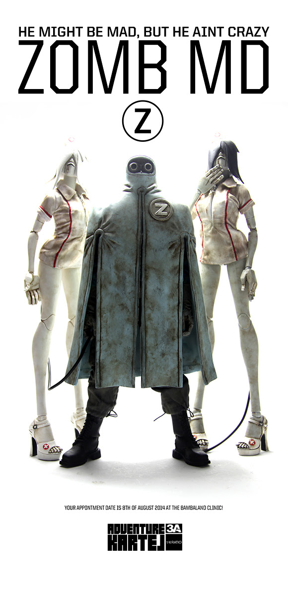 Ashley Wood's latest 1:6th scale 3A figure offering is now available for order (bambalandstore.com). ADVENTURE KARTEL - ZOMB MD, shipping 4th quarter 2014, is available as a single figure ($140) and also in a 2-pack ($260) that includes an ALBINO NURSE. Prices include free international shipping.
