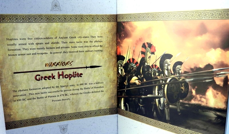The back of the box and inner flap display a wealth of information, including a full list of included accessories and a small history lesson on the Ancient Greek army. Great stuff and over all a class act presentation.